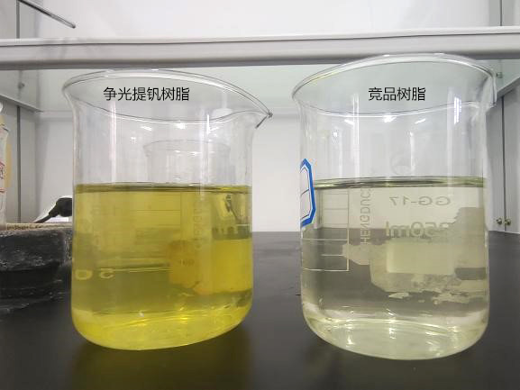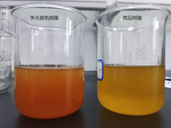 结果显示,1、争光提钒树脂对钒的吸附能力更强、吸附效果好,交后液中钒浓度钒泄漏量更低;2、争光提钒树脂钒洗脱率更高,解析效果好。这表明争光提钒树脂在吸附解析应用方面具有优势、性能更出色。